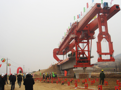 以及生產(chǎn)更新運架產(chǎn)品能架設(shè)跨度40M高速鐵路箱梁的:SXJ1000T/40M一跨式架橋機(jī)(配套攀爬式運梁車可以實現(xiàn)過隧道零距離架梁)和攀爬式運梁車。并能對現(xiàn)有32M分體式運架設(shè)備進(jìn)行改造,改造后能實現(xiàn)高低位架設(shè)跨度40M高速鐵路箱梁(高位改造不能過隧道,把原架橋機(jī)改造一跨式,把原運梁車增加2軸。低位改造能過隧道架梁,把原架橋機(jī)改造一跨式低位,把原運梁車改成攀爬式運梁車并增加二臺喂梁臺車實現(xiàn)過隧道架梁)。